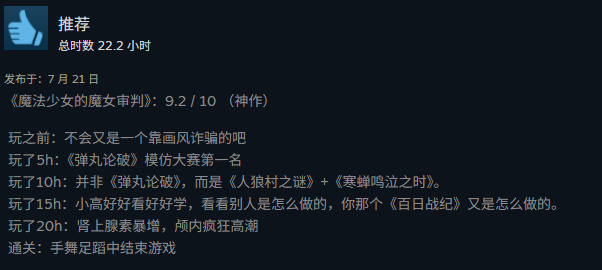 顯然《魔女審判》並不是一個完美的“AVG”遊戲,它依然有很多不能忽視的問題。比如它的系統仍有陳舊,沒有自動存檔和雲存檔,案件邏輯說不上嚴密,殺人動機千篇一律,但它又能用三十小時的體驗,讓不少人從懷疑一步步帶到沉迷,再到通關後去討論、分享,安利,這種體驗本身就已經非常難得。