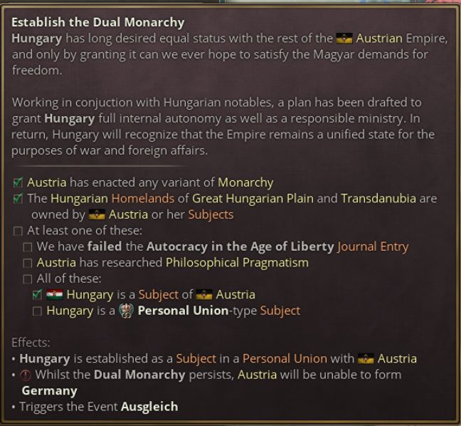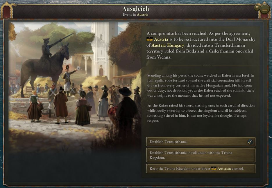 若選擇整合皇冠領地卻進展不順,妥協或成必要的選擇。“建立二元君主國”按鈕將實行歷史上著名的奧匈妥協方案,把帝國重組爲奧地利(內萊塔尼亞)與匈牙利(外萊塔尼亞)組成的共主邦聯。採用該決議將立即完成“匈牙利問題”日誌條目,但代價是永久喪失統一德意志的資格,並大幅增強匈牙利自治權。