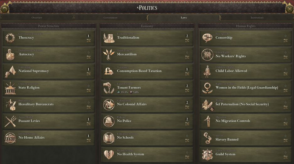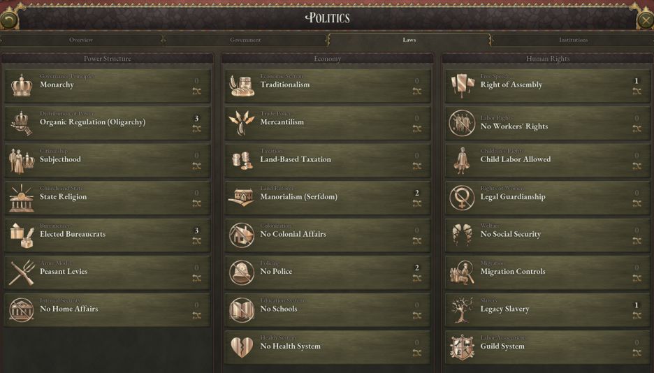 遊戲開局時,莊園制度在奧地利帝國與多瑙河的各個大公國內實施。說到多瑙河的大公國們,他們的法律設置也有變化。