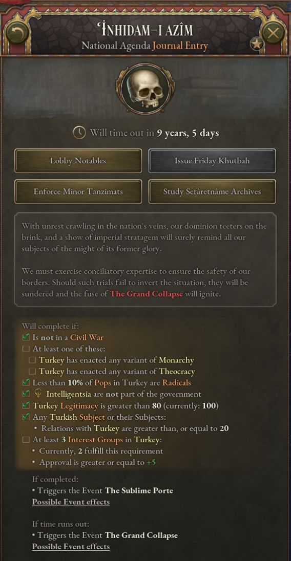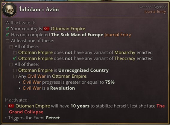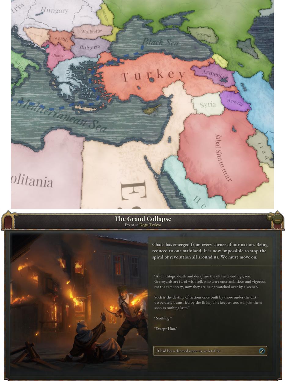 若不能在倒計時結束前完成,大崩潰便會觸發,帝國將四分五裂。土耳其將成爲一個被新獨立國家包圍的議會制[或總統制]共和國。