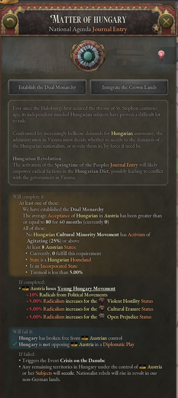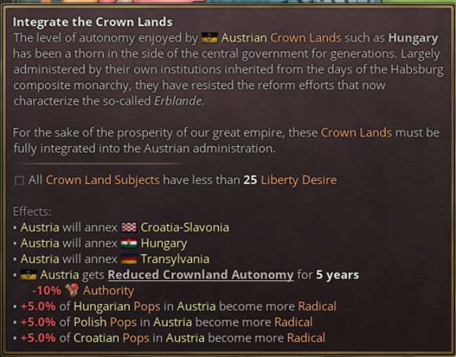 當所有奧地利皇冠領地附屬國的獨立傾向低於25%時,“整合皇冠領地”按鈕將變爲可用。該操作會將所有皇冠領地附屬國直接併入奧地利,使帝國整合爲單一國家。但此選項並不能完成日誌目標。吞併匈牙利僅是一步,若要真正解決問題,必須實現徹底掌控。