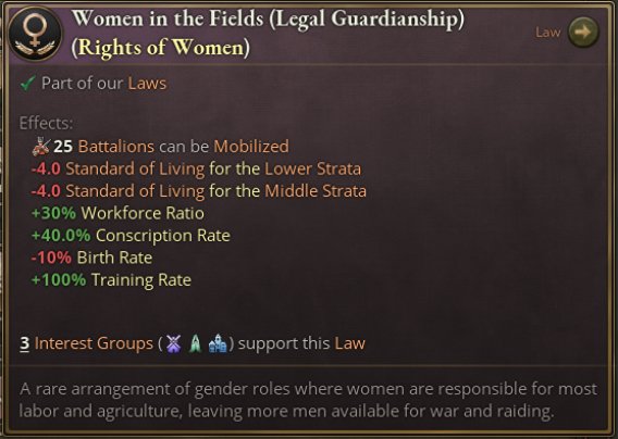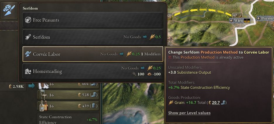 擁有莊園制度法律的國家使用一種全新的自給農場生產方式,勞役(Corvée Labour)。該生產方式會降低自給農場的產出,不過會爲所在地區提供建造效率。該修正代表地主將被迫勞作的農民派遣到建築工程中。