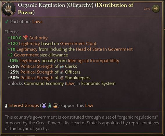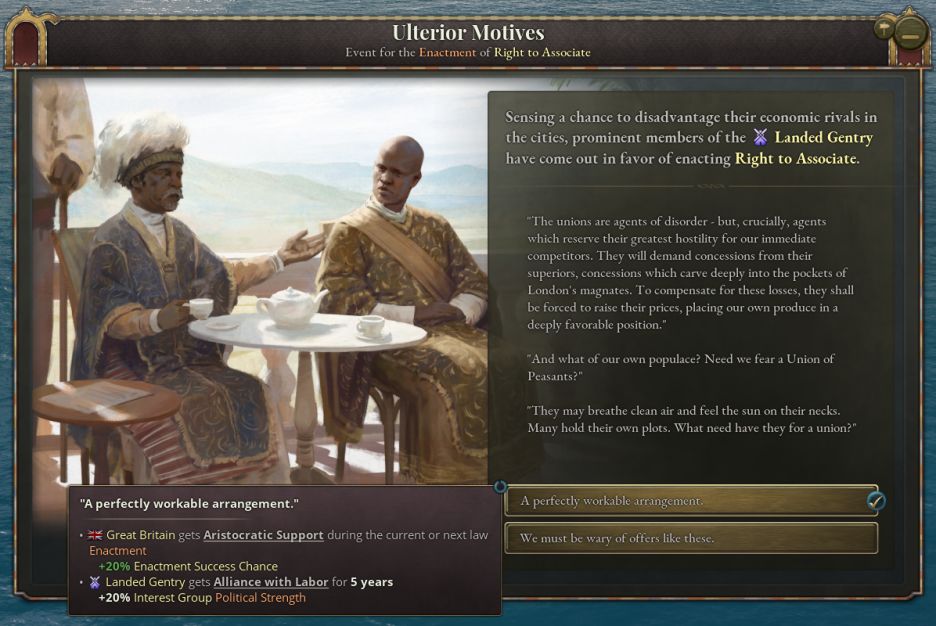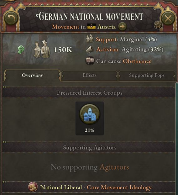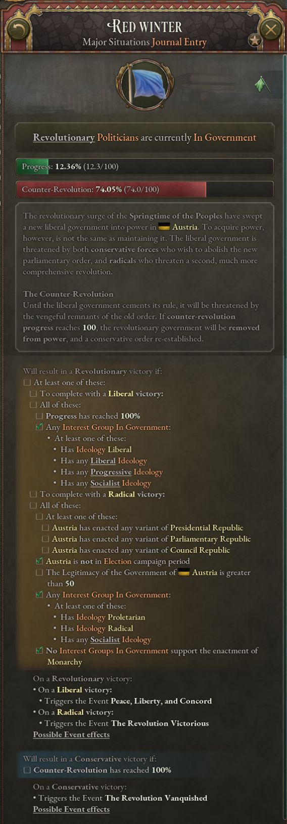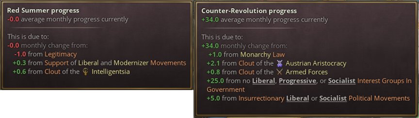 革命會因高合法性、自由主義運動與現代化運動的支持度、知識分子的勢力以及邊緣化的地主、軍隊利益集團而獲得進度。***會因君主制法律、地主與軍隊勢力、正在發生的暴動、叛逆的附屬國、自由主義利益集團未執政而獲得進度。不過,保守政治運動進入暴動會導致***進度下降——如果保守派是製造麻煩的一方,革命者就會認爲革命派纔是追求穩定的一方。