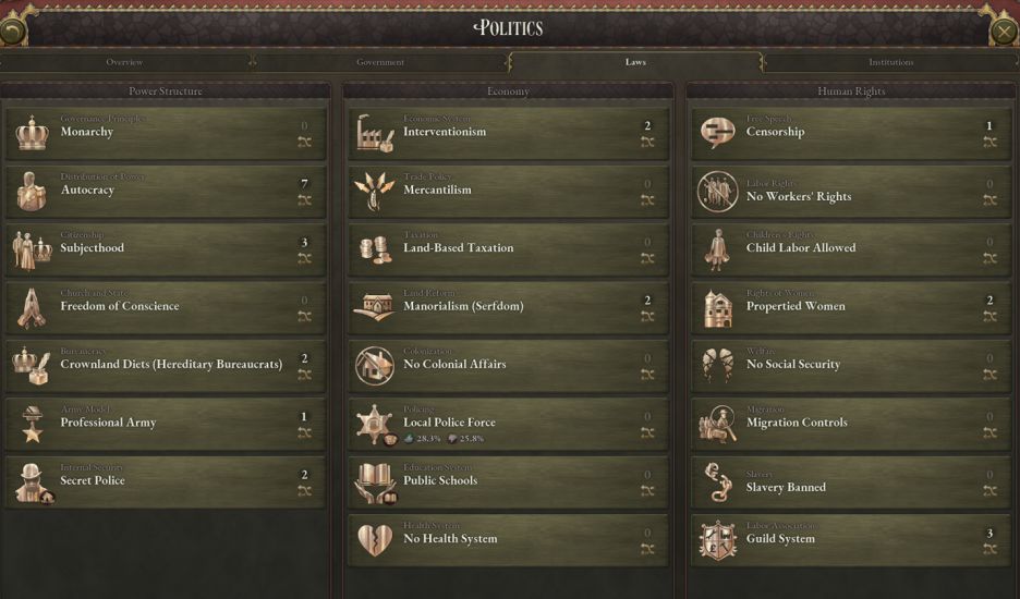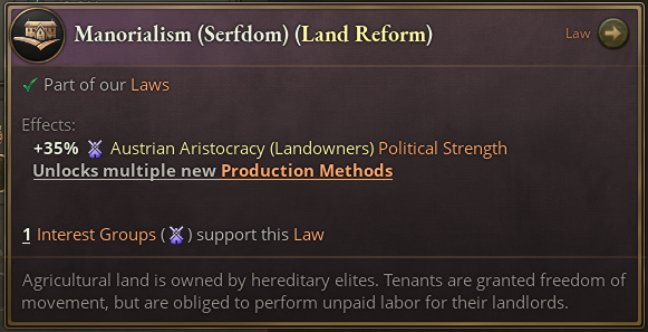 遊戲開局時奧地利的法律也有更新。其中,我們引入了兩種變體法律,王冠領地議會以及莊園制度。前者是世襲官僚制的一種變體,會削弱貴族的政治力量;後者則位於農奴制與佃農之間。