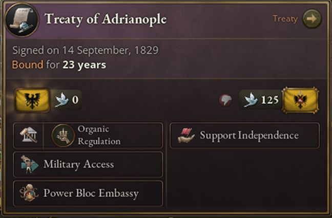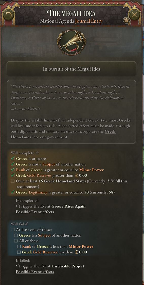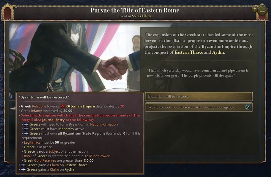 若希臘選擇追求“偉大理想”,並已在此目標的實現上取得一定進展,則將觸發允許其升級野心的特殊事件。追求東羅馬頭銜將使希臘惡名上升,並改變完成日誌條目所需的條件。
