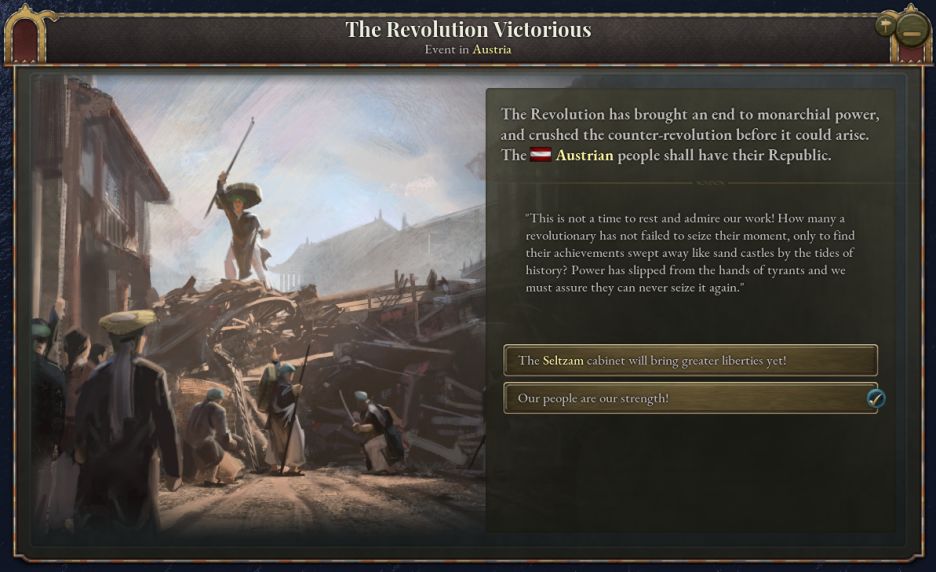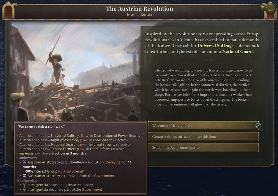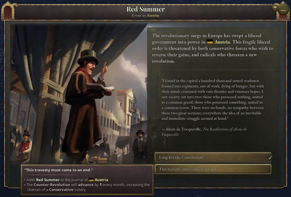 爲了更準確地體現1848年的革命進程,革命運動在日誌持續時間內有機會立即奪取政權。如果某個合適的運動開始暴動,且首都地區激進派佔比超過10%,那麼街壘會出現在首都,革命者將試圖奪取政權。