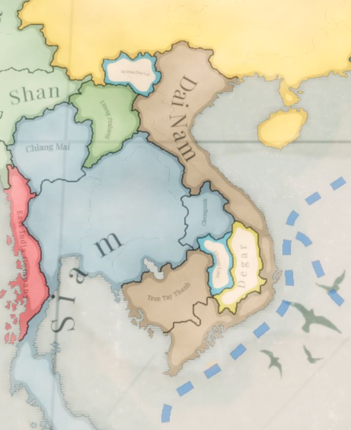 暹羅與大南之間烽火連年的邊境線也進行了重新調整,以更準確地呈現遊戲開局後該地區不斷變動的疆域格局。萬象——瀾滄王國故都——及湄公河流域周邊地區仍處於暹羅控制之下,而更內陸的區域(包括川壙高原)則在遊戲開局劃歸大南管轄。