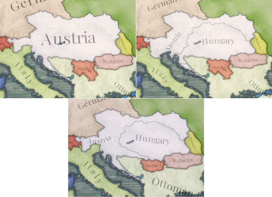 歷史上,奧地利帝國曾考慮過多種重構帝國的解決方案。我們將在詳解民族覺醒內容的日誌中探討其中大部分方案。而本篇開發日誌——也就是免費更新中提供的兩種方案,分別是整合皇冠領地與建立二元君主國。