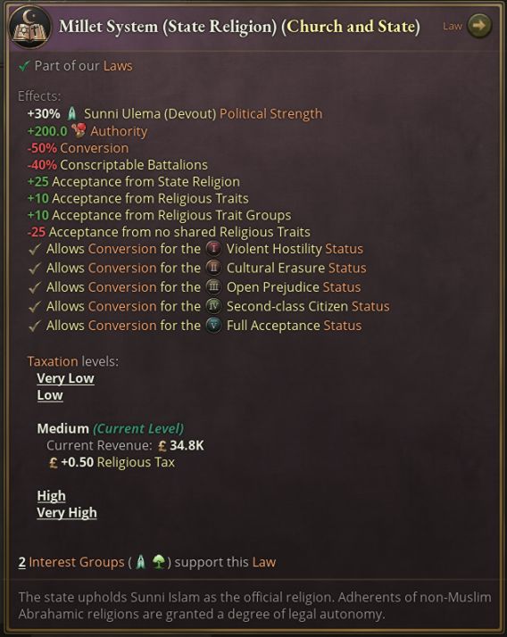 最常見的呼聲中有一條,希望我們還原奧斯曼帝國的米勒特製。該制度是一種族裔宗教自治制度,在奧斯曼哈里發的統治下,各個文化與宗教享有自治權。遊戲內的米勒特製將爲亞伯拉罕宗教提供更高接受度,但也更歧視其他宗教。此外,該法律也囊括了此前作爲修正出現的吉茲亞稅,能夠收繳更多賦稅,但降低可徵召營隊。