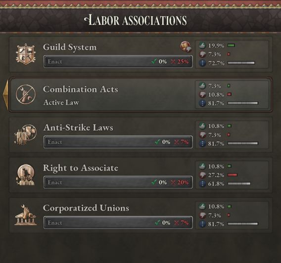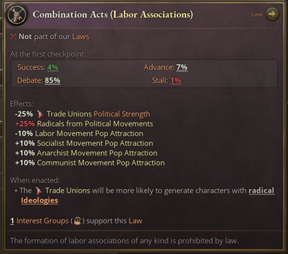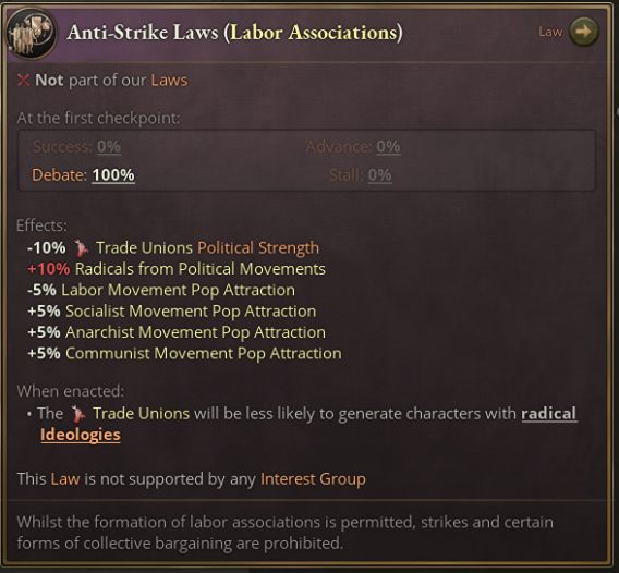 反罷工法案反映的是勞工協會合法化但罷工或勞資談判被限制的情形。該法律的歷史依據是英國1825年的《結社法》,遊戲開局時英國就實行該法律。該時期美國的情況也最適合用這條法律來概括——當時的傳統法律觀念認爲,罷工可能會受到法律制裁。