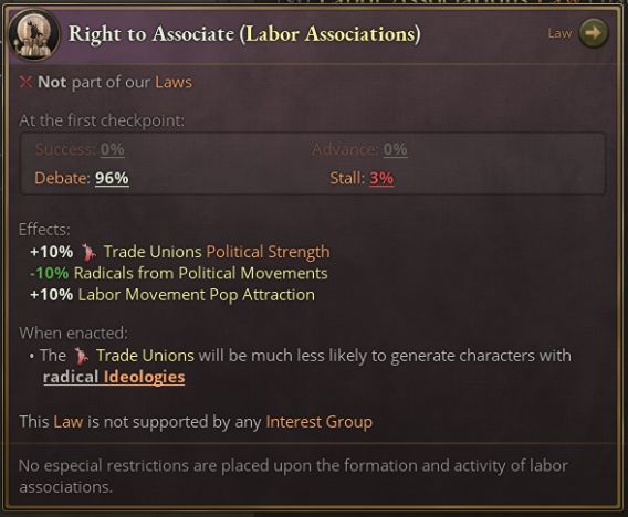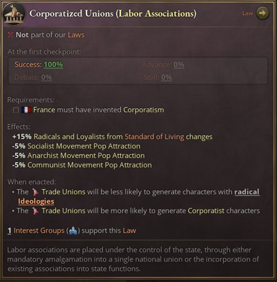 此法律組尋求表現該趨勢,當國家逐漸放鬆對工會的壓迫,工會利益集團的勢力會擴大,其內部出現激進派角色的概率會下降。勞工運動對人羣的吸引力也會提高,奪取本屬於社會主義、無政府主義與共產主義運動的份額。