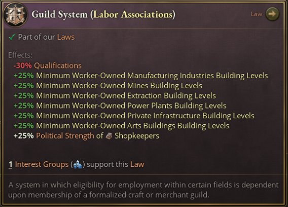 行會系統代表進入近現代之前的商人行會與手工業行會系統。在該系統下,技藝嫺熟的工匠和手藝人組織起一些機構,這些機構在其影響力範圍內規範其行業的從業行爲。一般而言,非行會成員被禁止在特定範圍內進行貿易活動,這顯著降低了社會流動性。由於該系統與自由流動的原則相悖,許多自由主義運動都將毀滅該系統作爲其目標。在遊戲開始時,大部分歐洲國家的行會系統都已被廢止或削弱,只有少數國家,如奧地利,還以某種形式保持着它們。