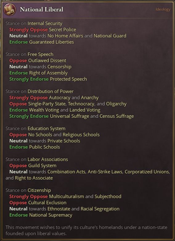 民族自由主義意識形態一定程度上融合了自由主義、激進主義與族裔民族主義者。該意識形態傾向於確保國家主流文化的熱情提高,支持公立學校與適合自己的公民權;傾向於保護自由;傾向於行會系統——我們會在後文提到這一部分。