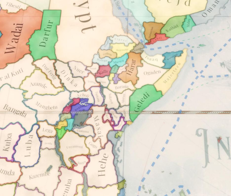 東非地區自遊戲發售以來基本未經改動,但目光銳利且遊玩過Paradox Interactive更多旗下游戲的玩家可能已經注意到:在Crusader Kings Ⅲ即將推出的內容包All Under Heaven中,地圖將擴展至斯瓦希里海岸區域。該地區在Crusader Kings Ⅲ中的精細化呈現,使我們得以利用部分相同資源重新開發Victoria 3的東非地區,最終實現了包括歷史悠久的斯瓦希里海岸及北部埃塞俄比亞地區的整體優化。