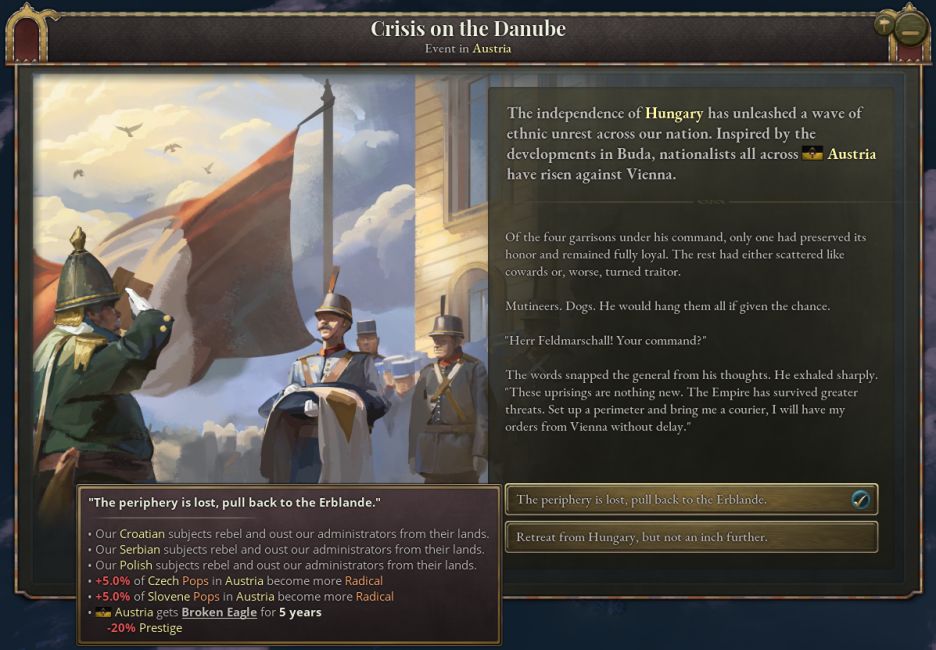遵循1.10版本和民族覺醒DLC聚焦奧地利及巴爾幹地區的主旨,奧地利專屬的“匈牙利問題”日誌條目已完成全面重構。該日誌條目包含兩項管理奧地利帝國的重要交互機制,其持續時間將直至實現匈牙利地區的徹底安定,或歷史上著名的奧匈妥協生效爲止。