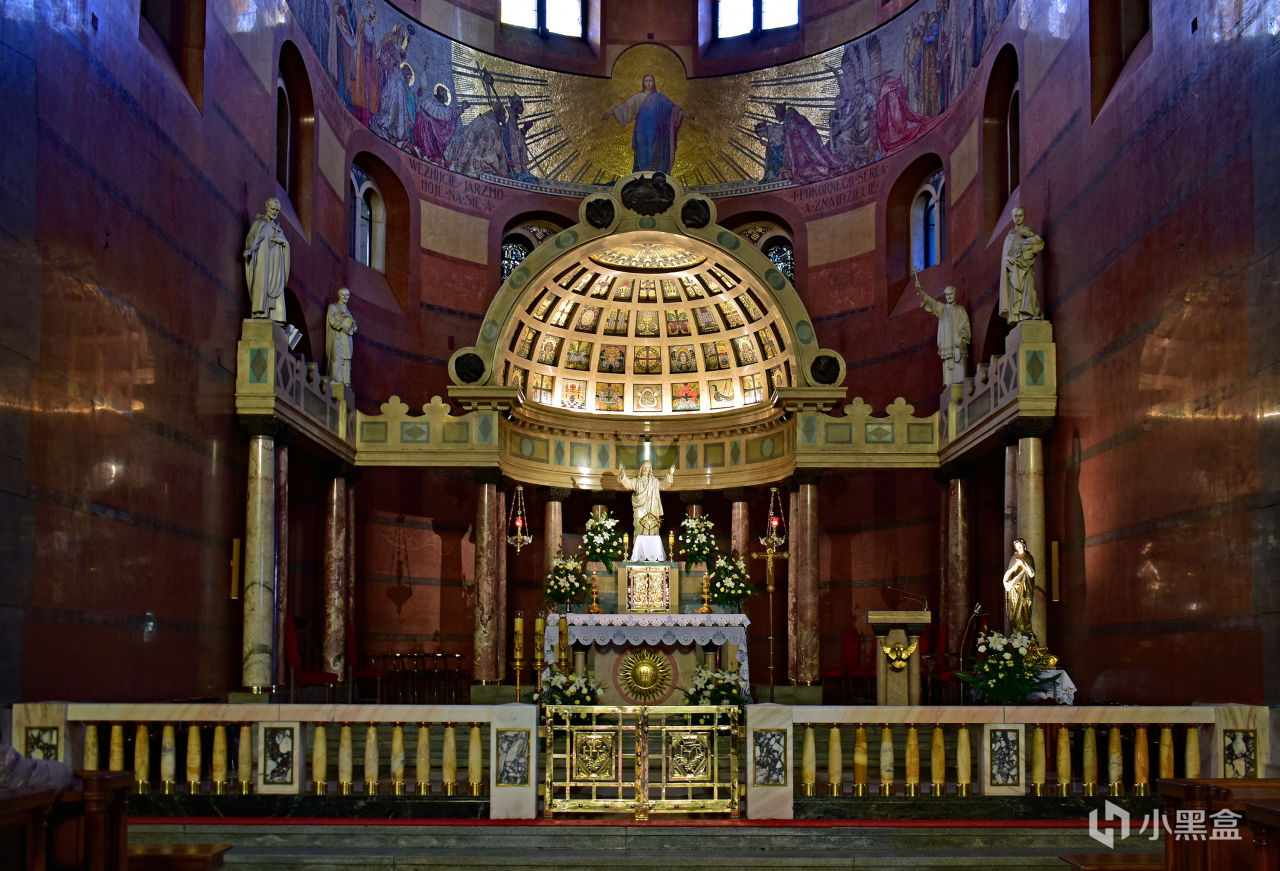 克拉科夫的 圣心大教堂 建于20世纪初,融合新巴洛克与现代风格。在游戏中,它被改造成赛博朋克世界的一隅,古老的宗教象征与冰冷的高科技形成强烈反差,视觉冲击力十足。尽管你可能一开始并未察觉,但主入口上方那精美的彩色玻璃马赛克,以及主祭坛的独特设计,都毫无疑问地揭示了游戏中这一场景的灵感来源。
