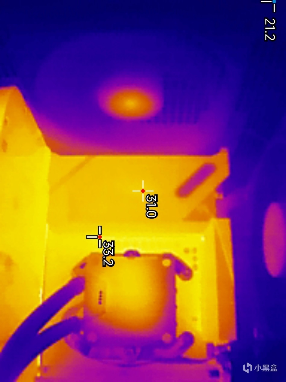 ▼主板左侧金属散热件的表面温度在31℃左右,供电模组的最高温度在33.2℃左右。