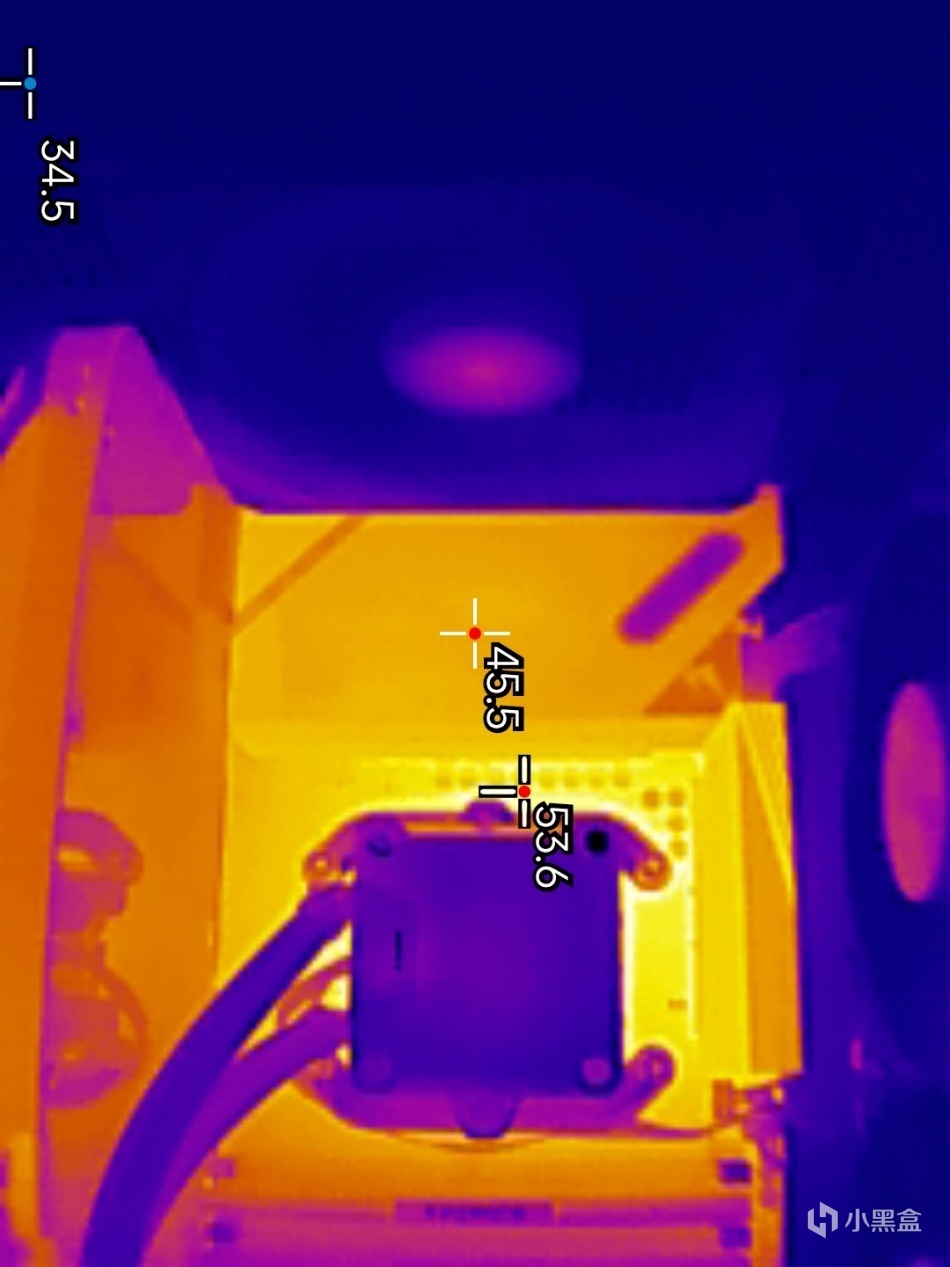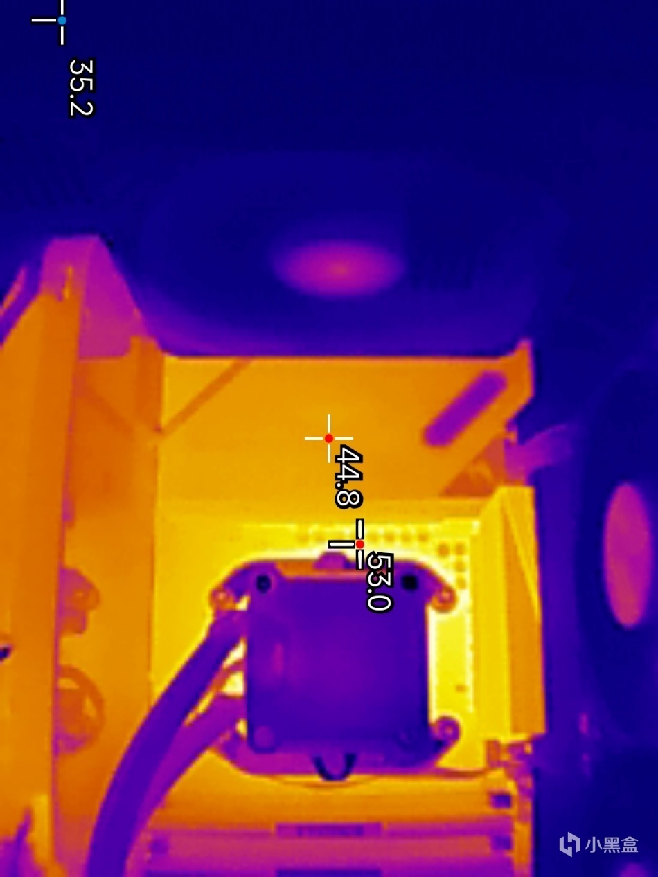 ▼主板左侧供电散热件的表面温度在44.8℃,供电模组最高温度在53℃左右,整体表现不错。