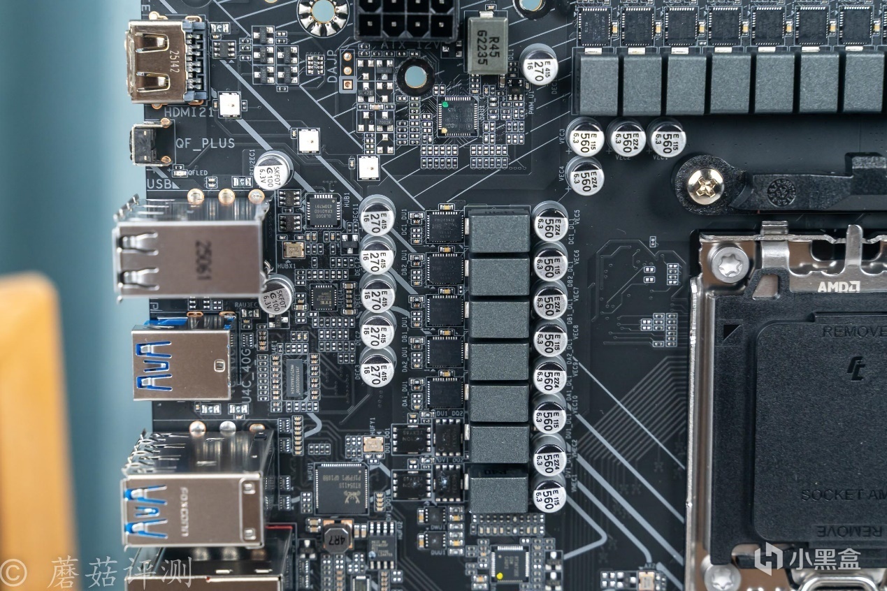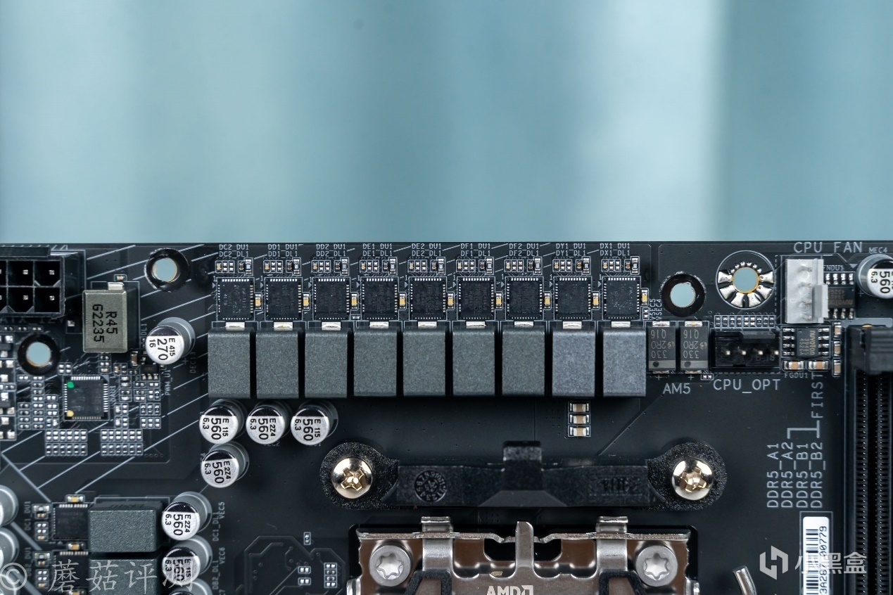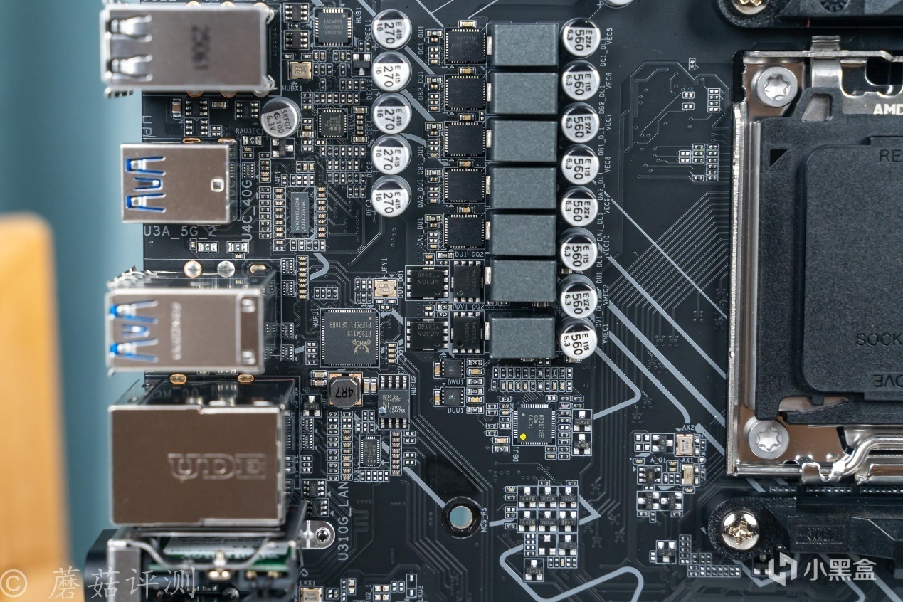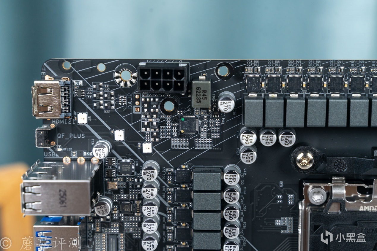 ▼主板的右下角是B850芯片,右上角是供电电路,右下角有多颗贴片LED。