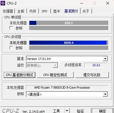 ▼简单跑个CPU-Z的测试,单核得分838.3、多核得分8898.4,分数很高。