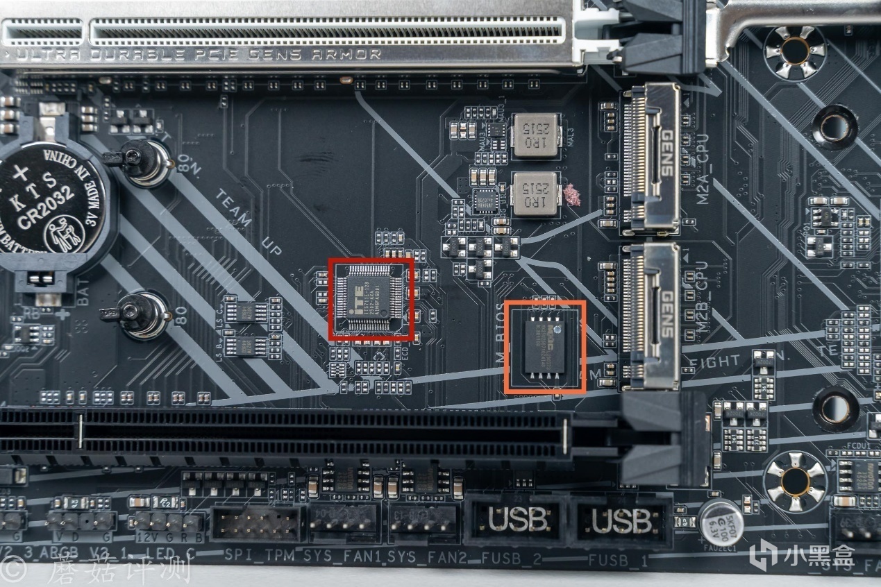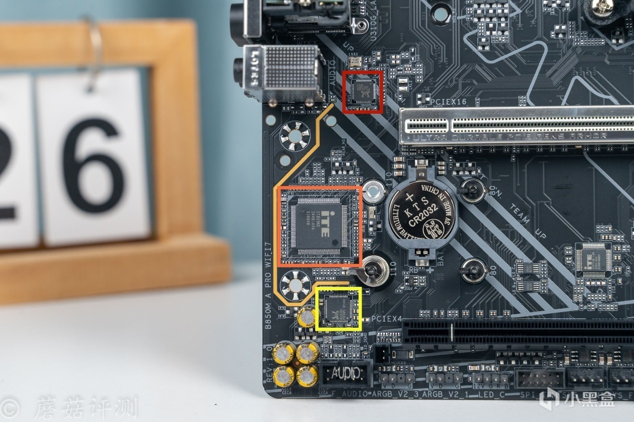 ▼红框芯片丝印RTL8125,给2.5G的有线Lan口提供支持。橙框芯片丝印IT8696E,Super IO芯片,用于监控主板的各项参数。黄框芯片也是小螃蟹出品,声卡芯片,丝印ALC1220。