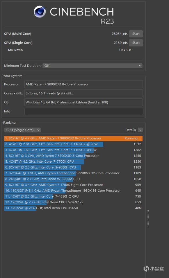 ▼跑个CineBench R23测试,单线程得分2139、多线程得分23054,分数都很高。