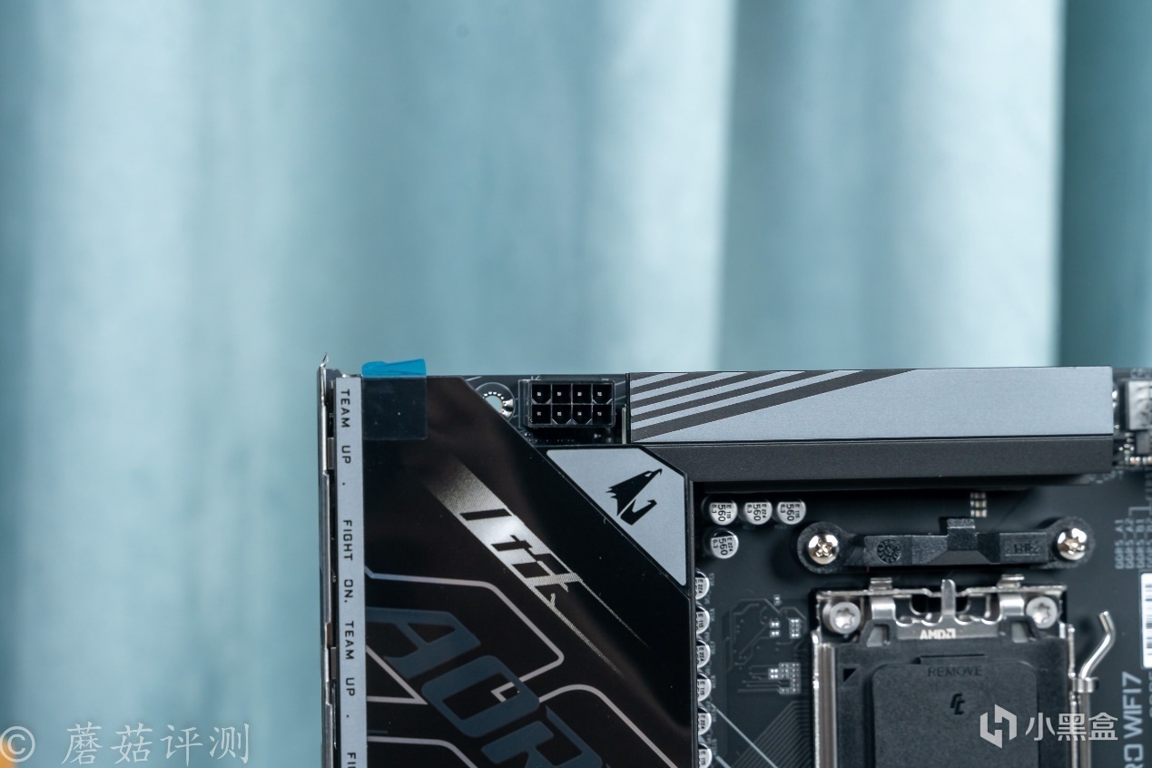 ▼这块技嘉B850M电竞雕主板,左侧供电散热件的上部,有一小块的RGB灯效,支持主板控制。旁边还有一个小小的技嘉大雕LOGO,看着很精致。