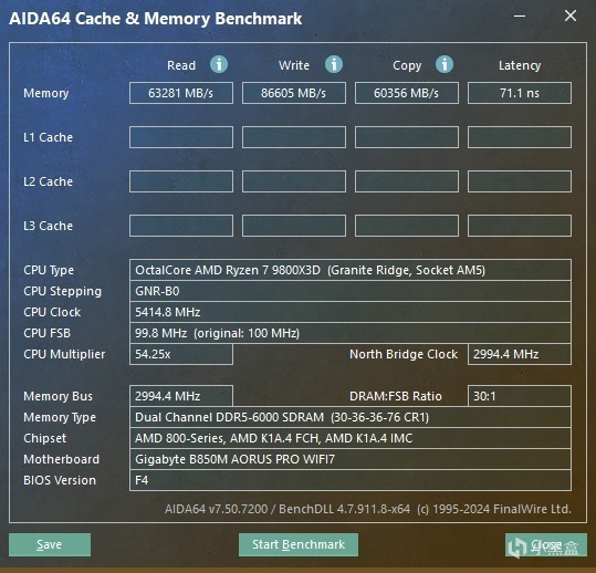 ▼默认在主板BIOS中打开内存高频宽功能,跑个内存的测试,内存读取速度63281MB/s、写入速度86605MB/s、复制60356MB/s,延迟71.1ns,性能很给力。