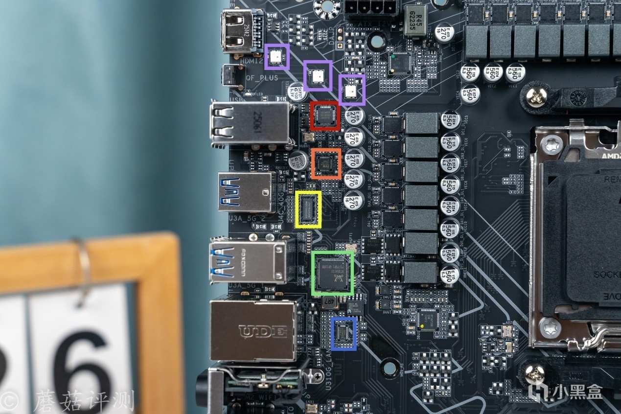 ▼主板后部,各种芯片众多,红框芯片丝印GL850G,这是一颗USB 2.0的HUB芯片,给主板后部的四个USB 2.0接口提供支持;橙框芯片丝印8851FN,USB PD控制器,给主板后部的USB-C接口提供PD握手支持;黄框芯片JYS15002CE00,这是一颗USB 4中继芯片,给主板后部的USB-C接口提供支持;绿框芯片丝印RTS5411S,USB 3.2 Gen1 HUB芯片,给主板后部的多个USB Type-A Gen1接口提供支持;蓝框芯片丝印P13EQX10,这是一颗多路复用器解复用器转接驱动芯片,给主板后部的USB Type-A Gen2接口提供支持;最上面还有多颗紫框的贴片式LED芯片,给主板左侧金属散热片的RGB灯效提供支持。