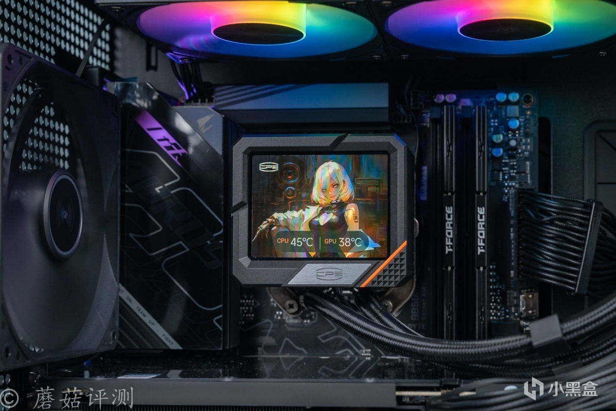 ▼超频三的北境GT240一体式水冷,这块屏幕的显示效果很棒,底部有处理器、显卡温度,可以实时查看机箱内主要硬件的运行状态。