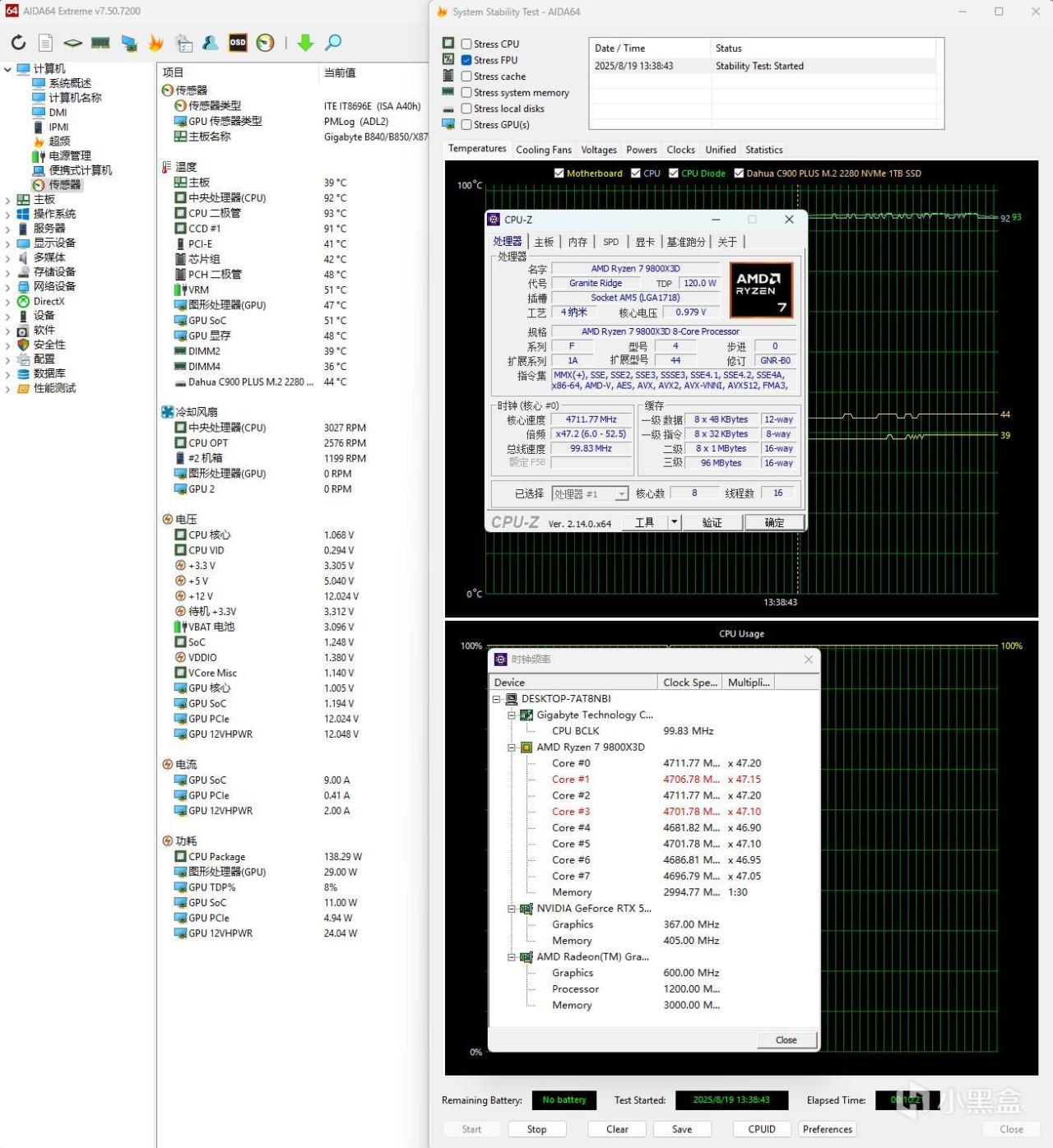 ▼简单看下9800X3D的硬件参数,这颗处理器拥有8核心16线程,三级缓存96MB,很大。