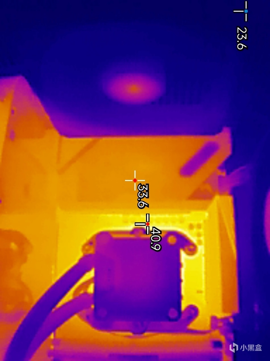 ▼主板左侧供电散热件的温度略有提高,在33.6℃左右,主板供电电路最高温度在40.9℃左右。