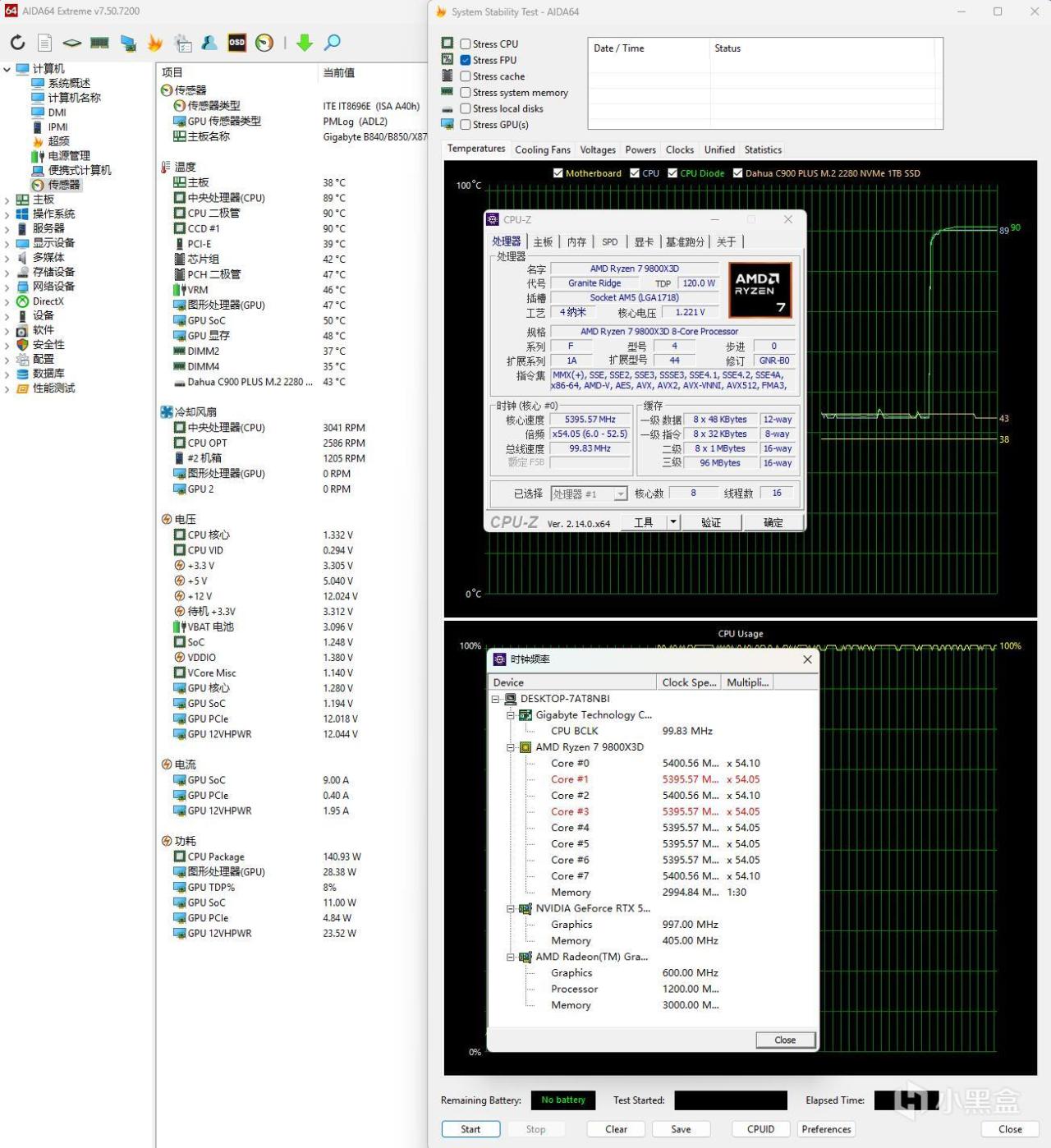 ▼跑个CPU-Z的压力测试,处理器功耗在140W左右,全核心睿频5.4GHz,温度89℃,供电温度46℃。