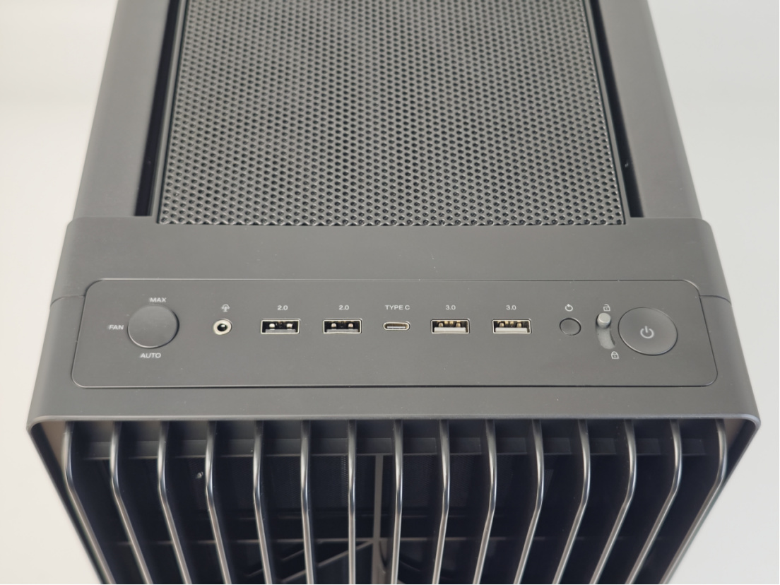機箱IO 從左到右分別爲風扇控制、3.5音頻口、A口、C口、重啓、IO鎖定、開關