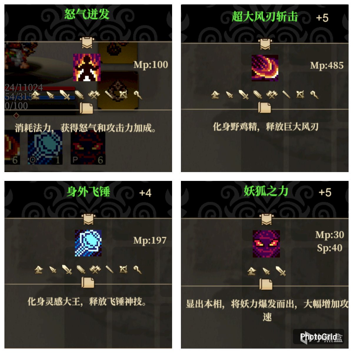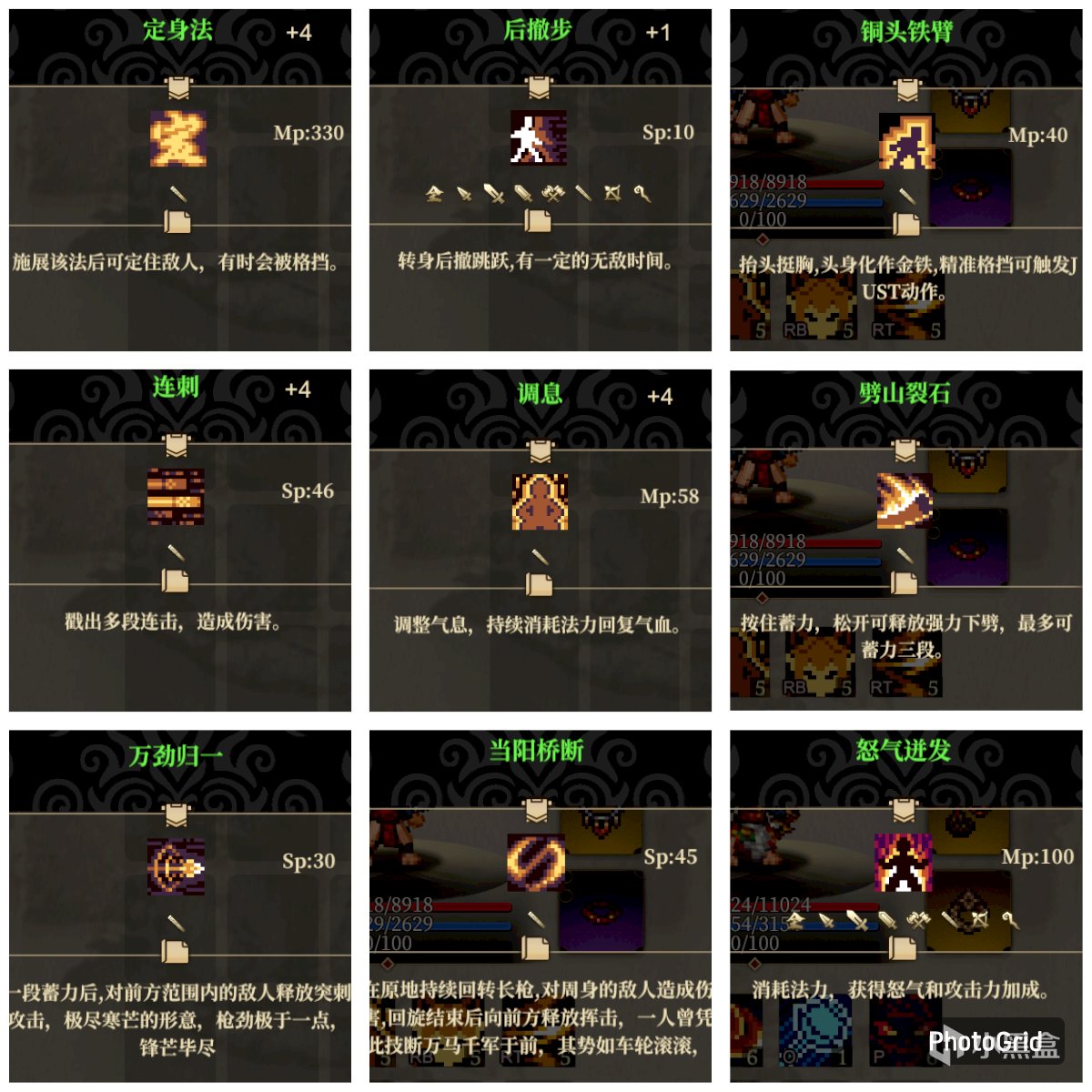 截至我打到结局,总共解锁了27个技能,所有角色都可以用的有6个(但并不是标有“全”字,这个我还没想明白,可能标“全”字的条件是不止可以用到一个武器上),大多数是辅助(如增加攻击、增加怒气、闪避),也有“身外飞锤”这样的攻击技;其中棍可以用的技能是最多的,有足足17个(下面将介绍部分重要技能)