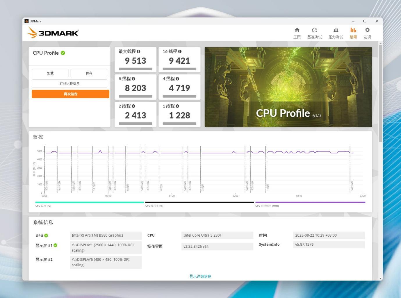 看看这款CPU的体质如何,运行3DMARK CPU Profile,单线程1228,最大线程9513。
