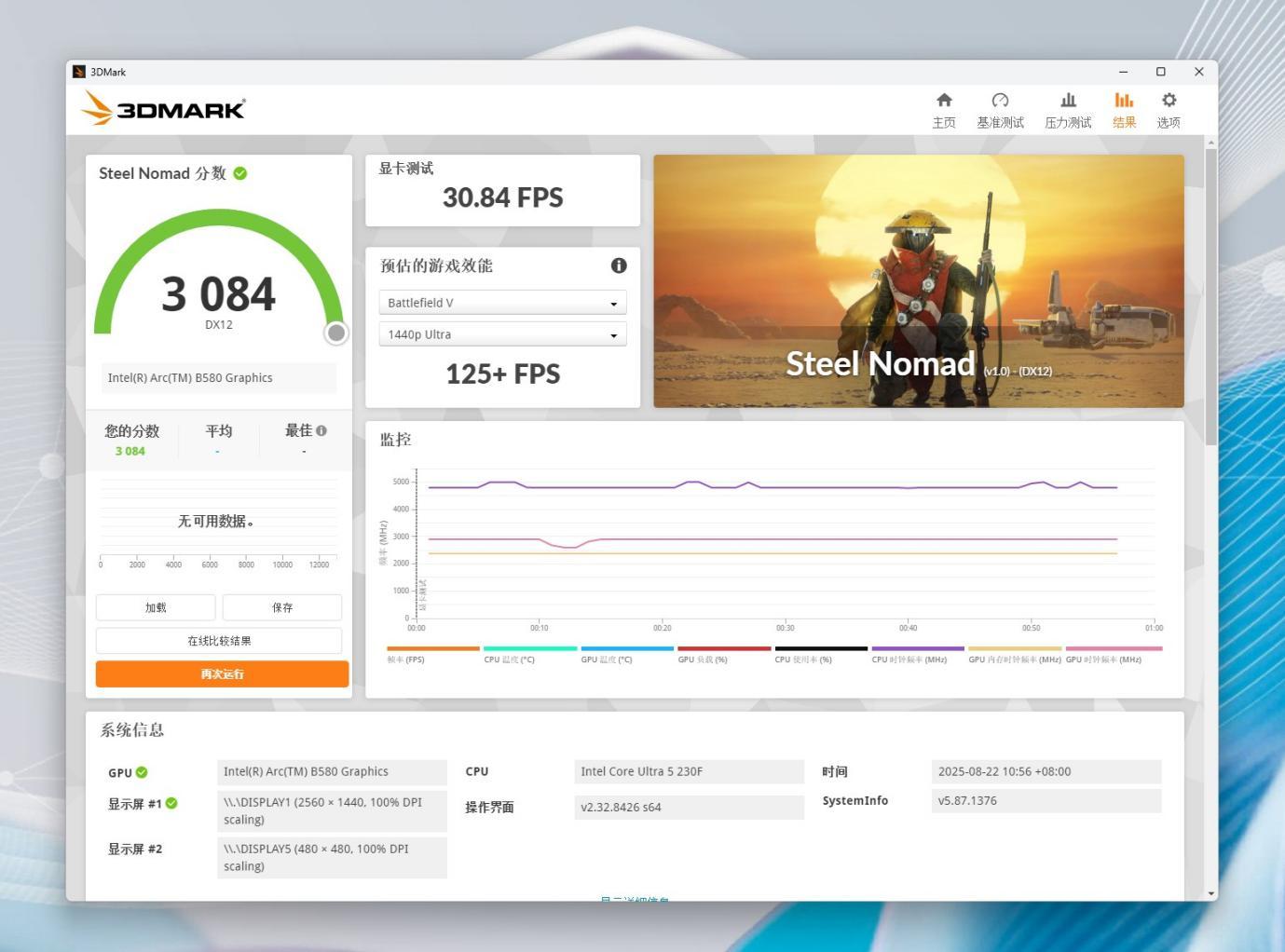 再来看看游戏,3DMARK Steel Momad 3084分,战地五预计帧数125+。