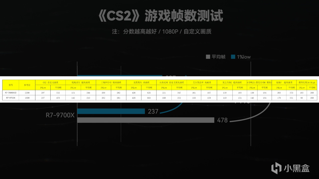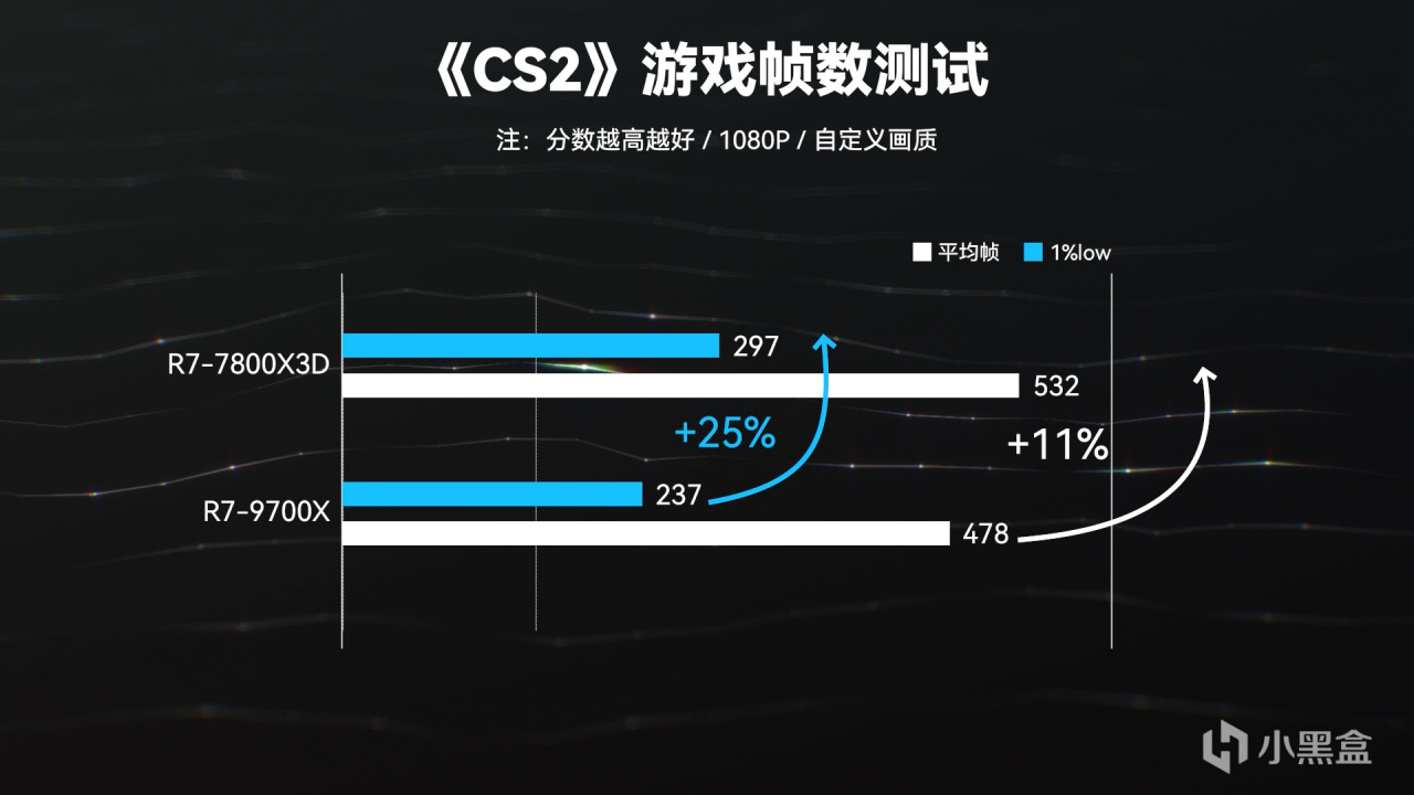 当然,除了X3D无间外,在CS2这款游戏中,783的帧数也会相较于97X高出不少,在平均帧上提升了11%,而1%Low帧则是来到了25%,CS2也不像以前CSGO了,帧数还是比较吃配置的。