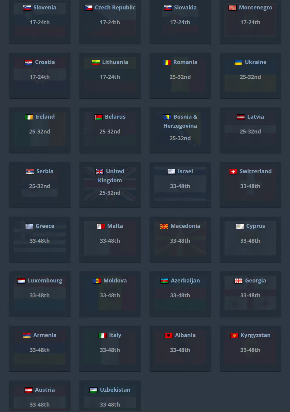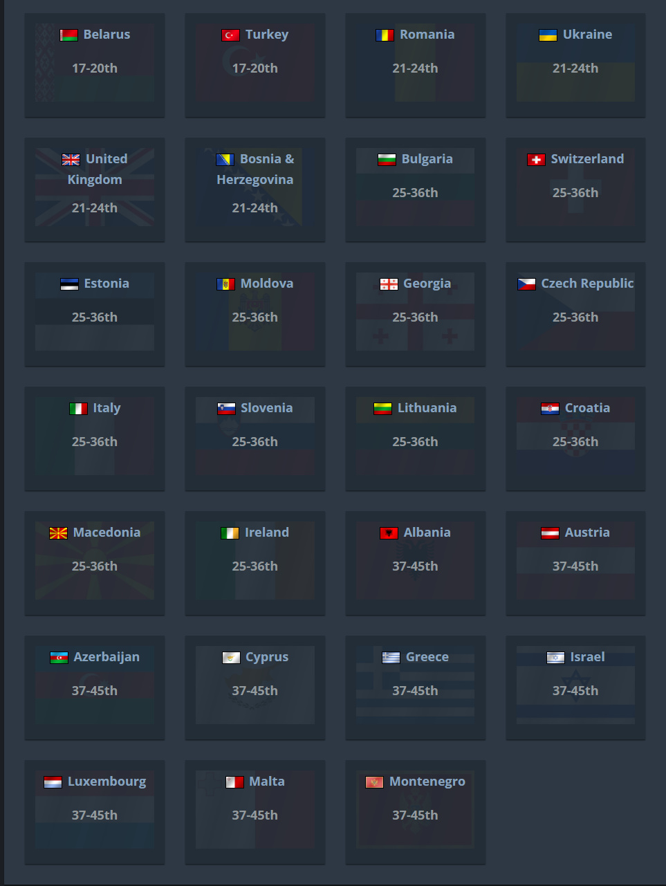 注:地理位置屬於亞洲的亞美尼亞、阿塞拜疆、格魯吉亞、烏茲別克斯坦、吉爾吉斯斯坦、哈薩克斯坦屬於獨聯體,併入歐洲賽區,西亞部分地區也歸屬歐洲賽區。