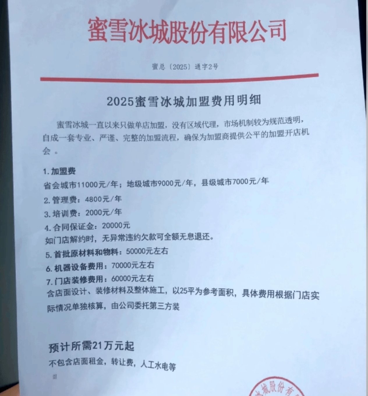 8月25日,一则“蜜雪冰城加盟费21万起”的消息登上热搜,引发广泛讨论。对此,蜜雪冰城官方招商顾问回应称,预开店总投资确为21万元起,但该费用不含店面租金、转让费等其他支出,并公布了详细费用结构与加盟条件。
