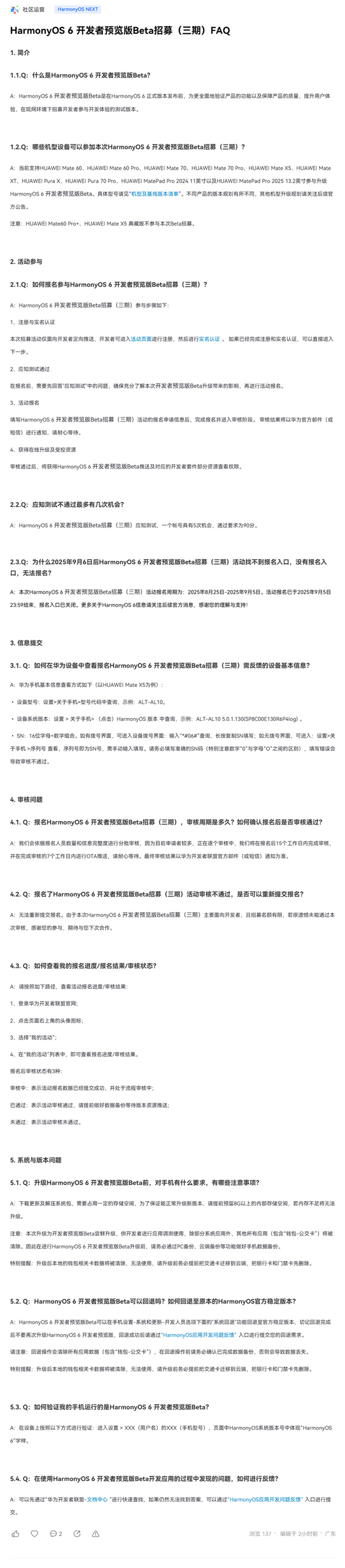 快科技7月30日消息,据华为开发者官网显示,HarmonyOS 6开发者预览版Beta招募(三期)已经正式开启。