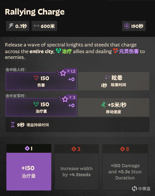 升級效果:+150治療量/增加4名騎士/+150傷害,+0.5s眩暈