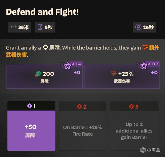 升級效果:+50屏障 / 屏障存在期間還會獲得+25%額外射速/給予目標附近最多兩名額外友軍會屏障