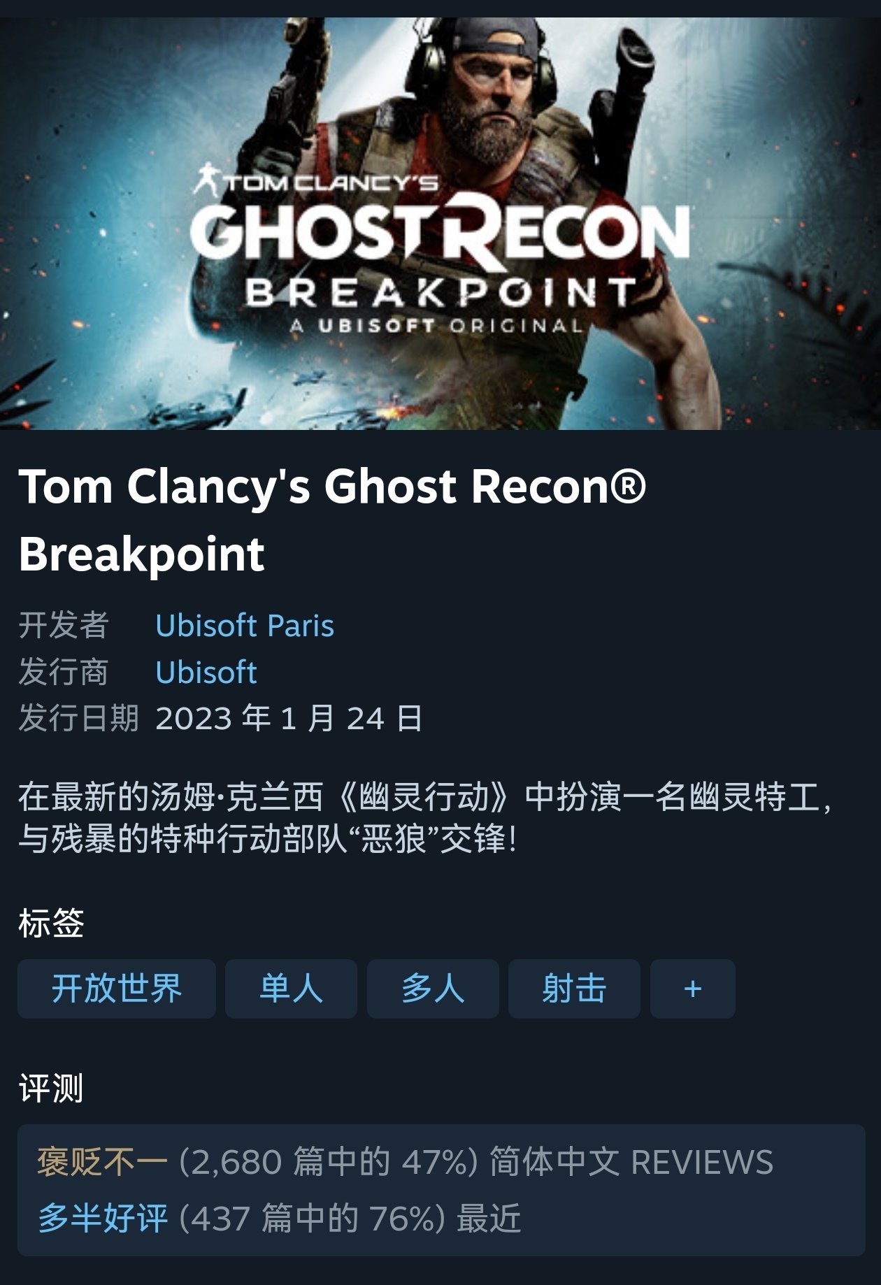 大家好,就在今天,育碧旗下的《幽灵行动:断点》迎来了史低,游戏价格直接重回一折的29.8元,只能说那些等等党算胜利了,因为游戏已经很久都未达到一折的折扣水平了,游戏为幽灵行动的最新作,为第三人称游戏,地图大是幽灵行动系列带给玩家最直观的感受。