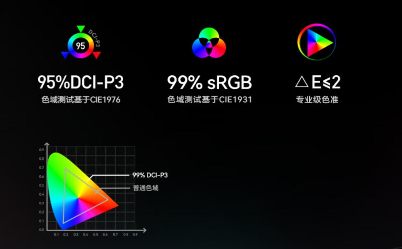 95%的DCI-P3色域,99%的srgb色域,▲E≤2,8bit色深。