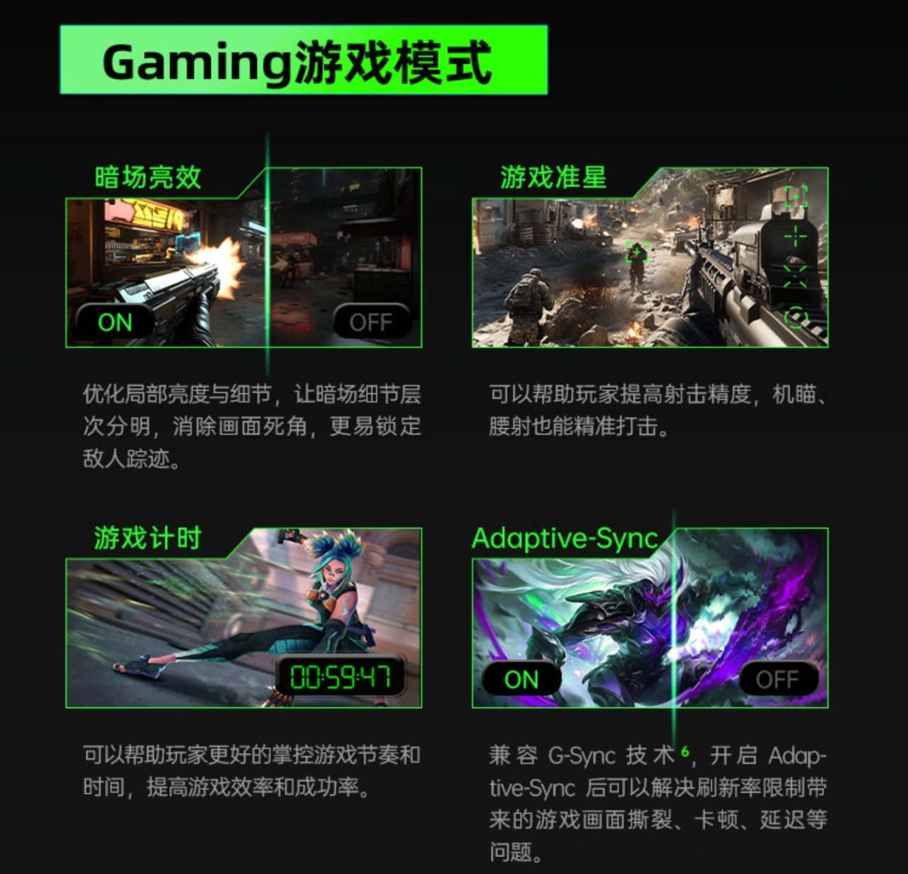 暗場亮效,遊戲準星,遊戲計時,Adaptive-sync,四大遊戲模式。