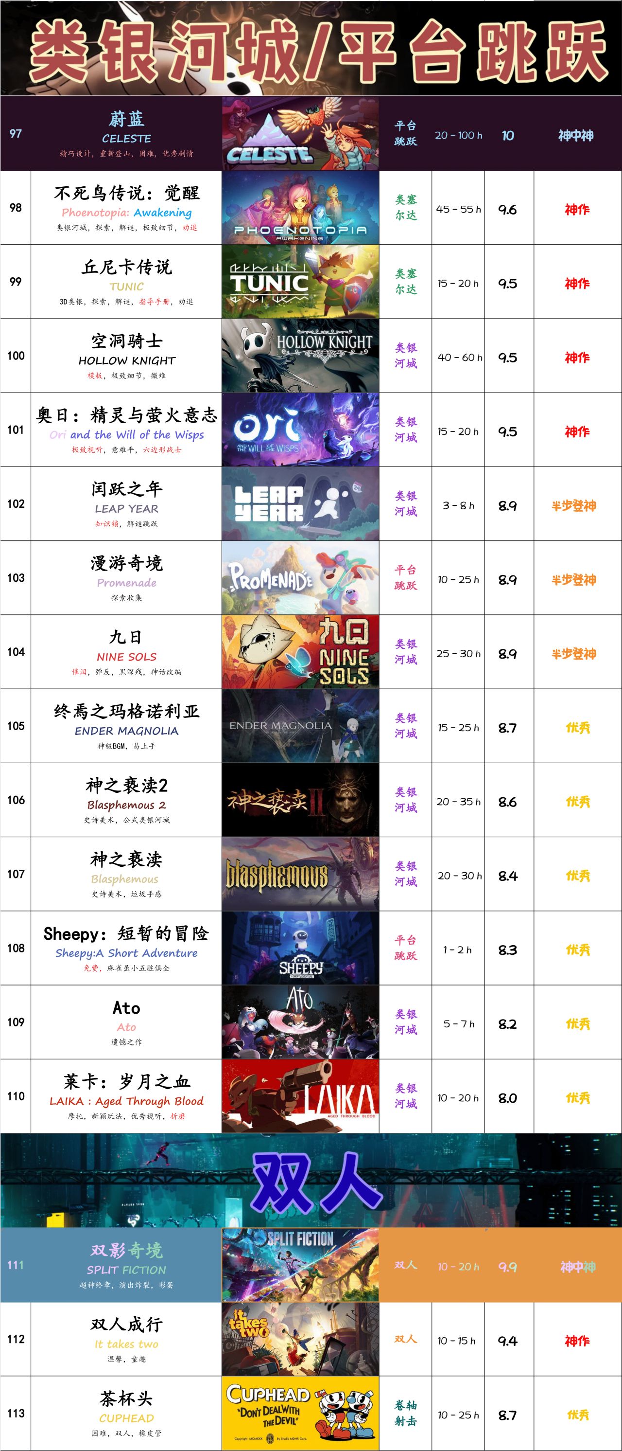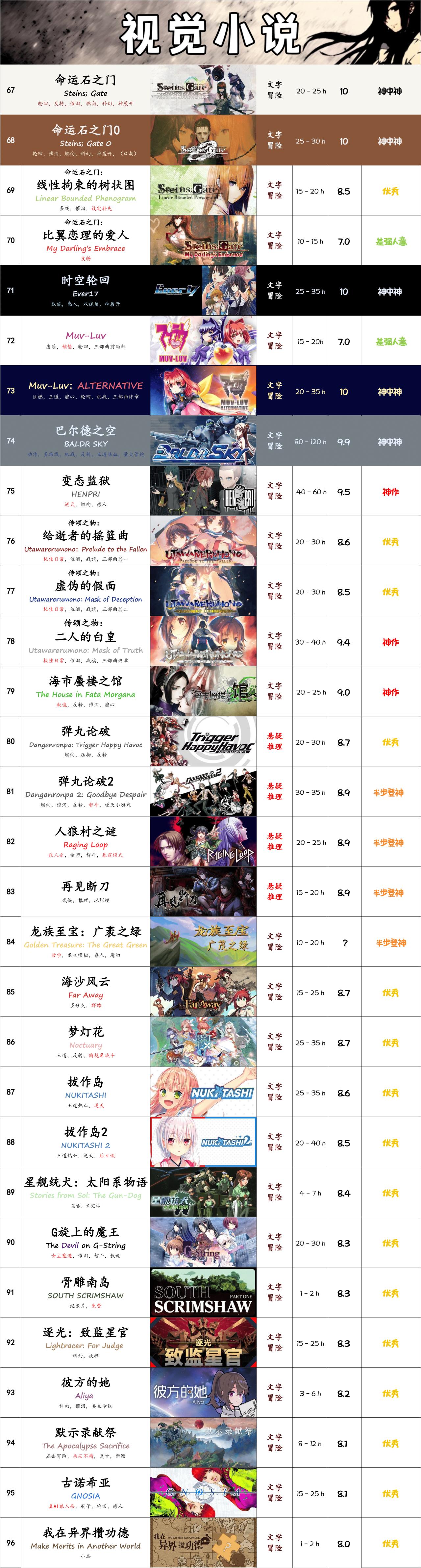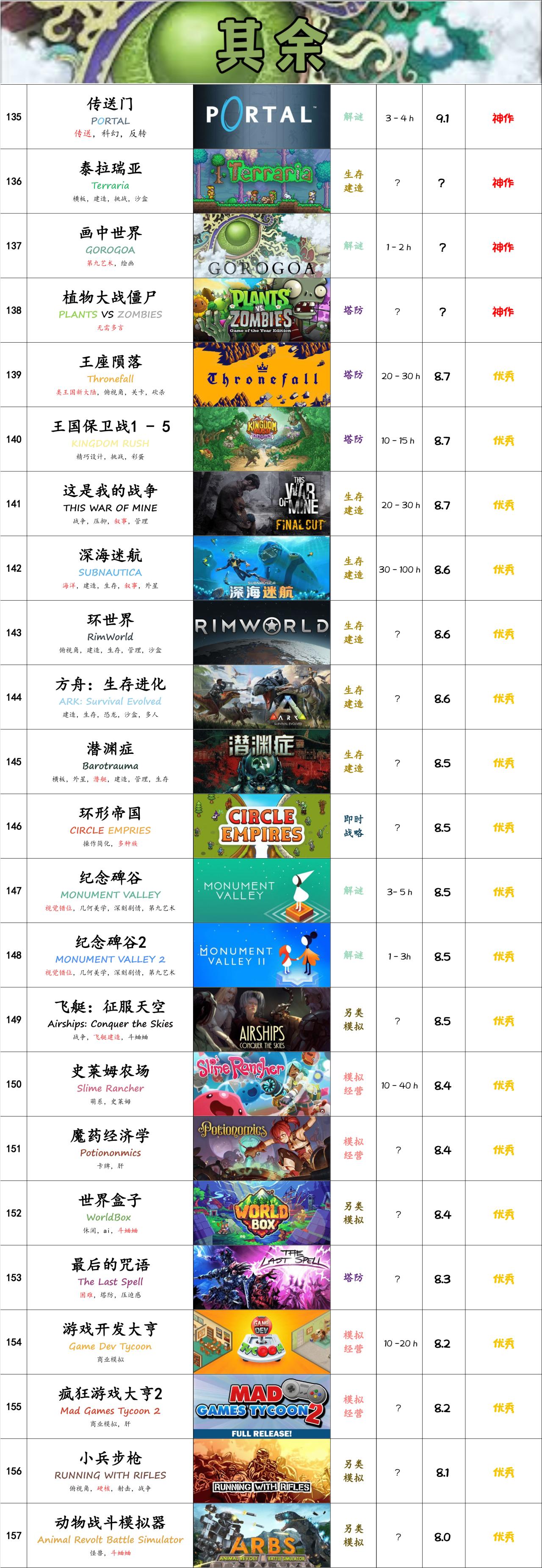 有些人可能會好奇,爲什麼這張表裏基本全是8分(優秀)以上的。答案很簡單,低於8分以下的遊戲在我的眼中就是用來消磨時間的。這些遊戲幾乎不會給我帶來任何的觸動,那我也確實沒有太多理由去花費精力推薦(本質還是懶)。