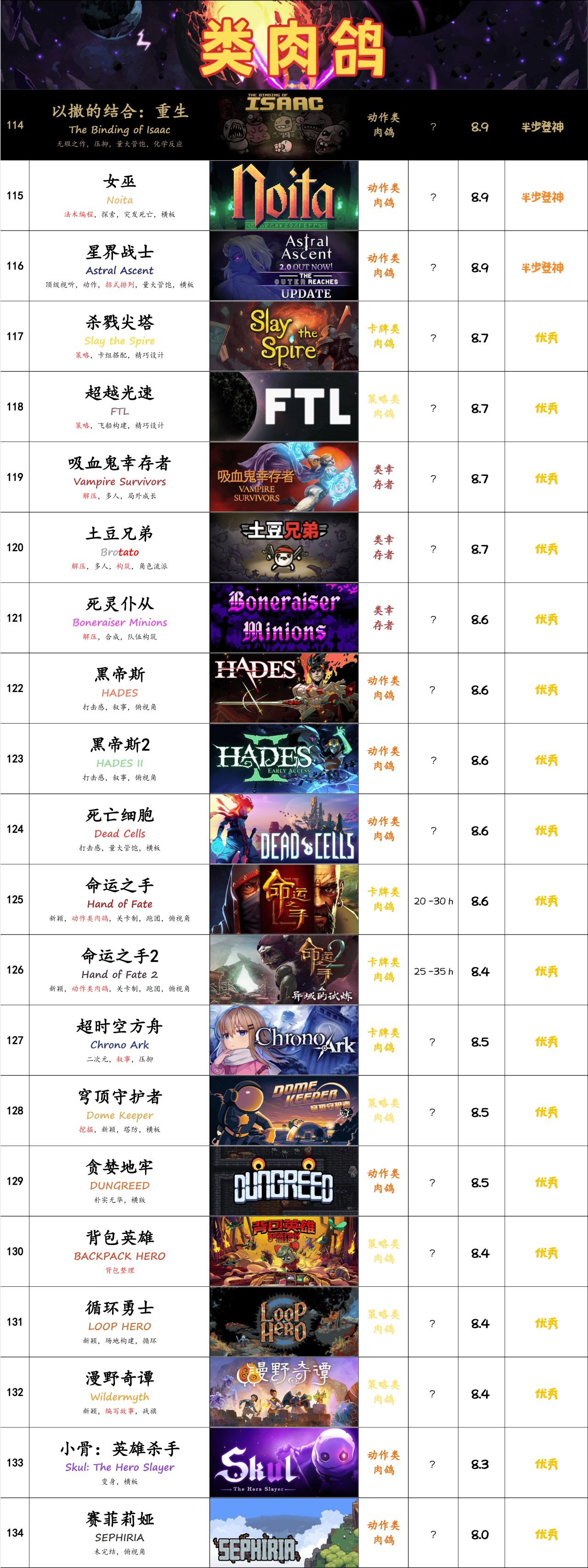但我想做的,並非是那種評分彙總,而是我自己的主觀評分。目前的我,確實是不太喜歡肉鴿,所以哪怕做的再好,也無法觸動我太多,那它的分數就到頂了。哪怕我也認爲這些遊戲已經無懈可擊了。