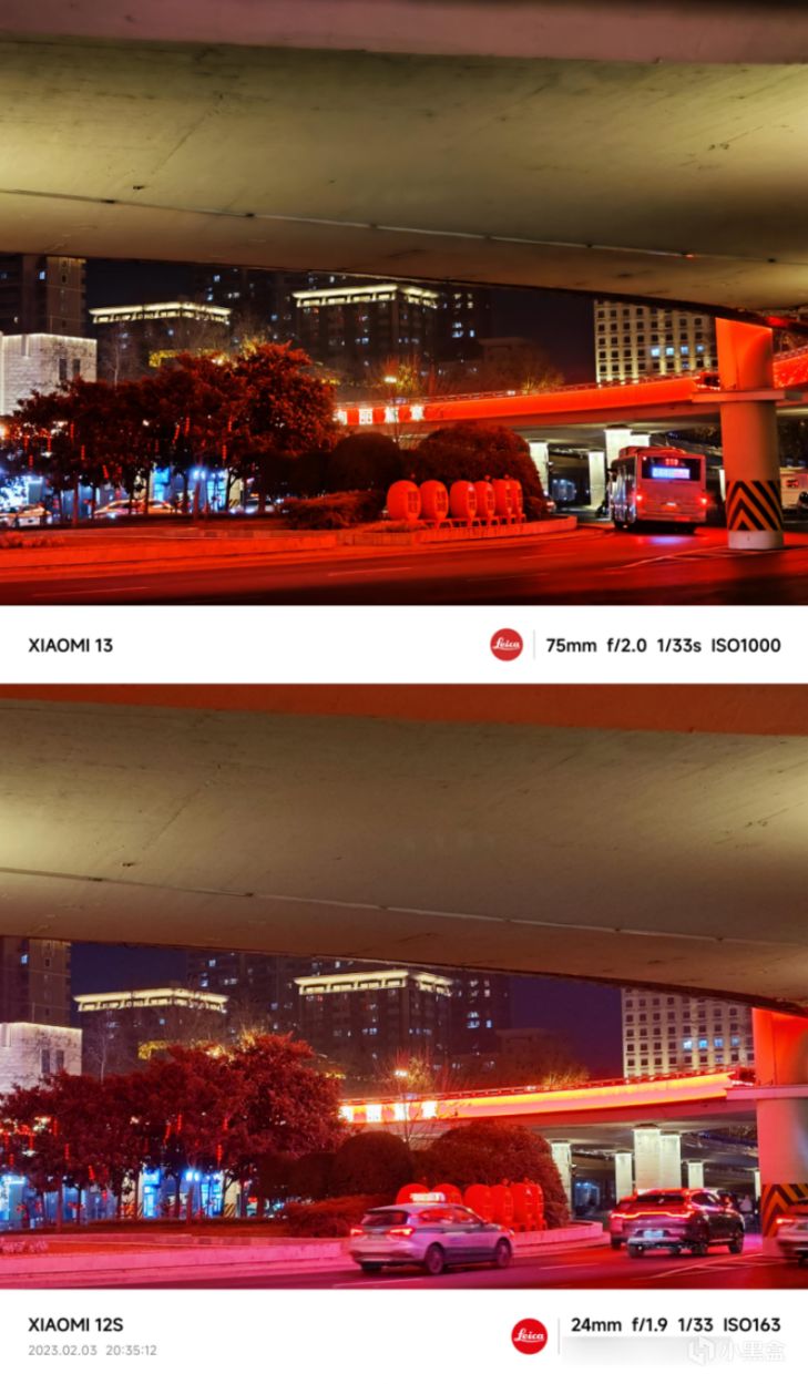 也不能光比12S的长处,13的长焦优势也来看看,同样是3.2x变焦,乍一看13涂抹不少,但小米13将桥上灯箱高光压住,文字拍的十分清晰,12S就过曝不好辨认,画面也发灰、显平,中间花坛装饰上的字也可以辨认出,12S模糊成一片。